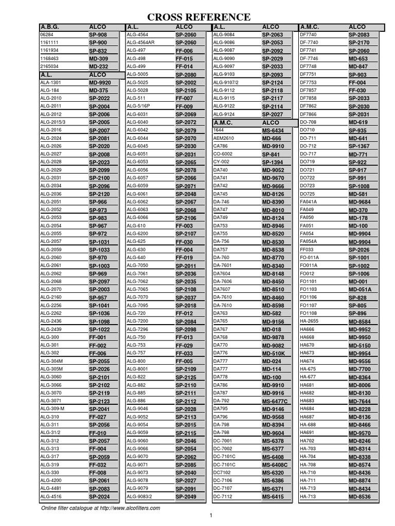Alco Filter Cross Refrerences 2019